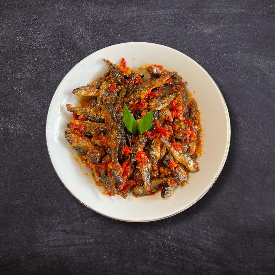 gurihnya ikan bilis yang digoreng renyah dan pedas segar sambal lado merah khas dapur Minang.